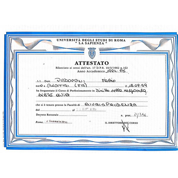 Nel 1988 ho conseguito il Diploma di Maturità classica al Liceo Conti Gentili di Alatri (FR). Nel 1994, ho ottenuto la Laurea in Giurisprudenza presso l’Università La Sapienza di Roma con il voto di 101/110. La mia tesi in Diritto Civile, "Profili civilistici dell’occupazione acquisitiva da parte della Pubblica Amministrazione," è stata guidata dal Prof. C.M. Bianca. Successivamente, nel 1995, ho partecipato con successo al corso di perfezionamento in “Diritto della Responsabilità civile” e nel 1996 ho ottenuto l'attestato di partecipazione per la preparazione al concorso di Avvocato a Roma presso l’Istituto Studi C.E.I.D.A.