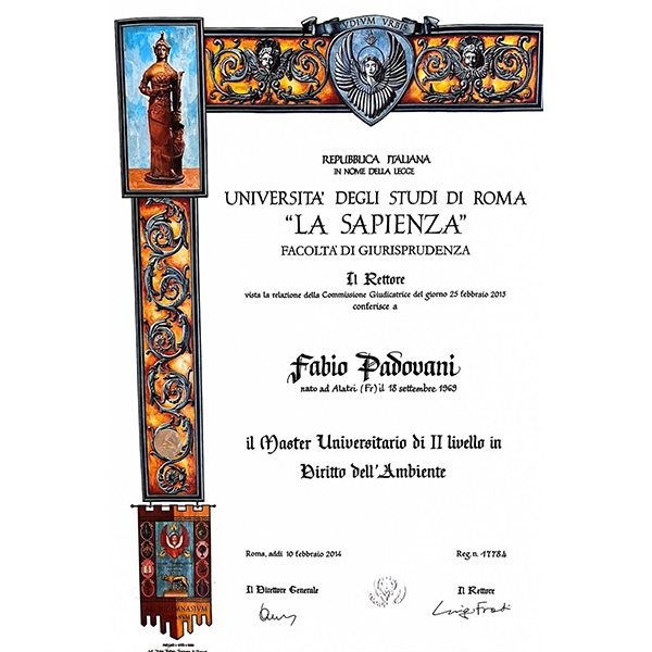 Nel 2011, sono stato nominato consulente del Settore Ambiente della Provincia di Frosinone, affrontando le problematiche legate alle autorizzazioni per l’installazione di impianti fotovoltaici. Nel biennio 2011-12, ho conseguito un Master Universitario di II° Livello in “Il Diritto dell’Ambiente” presso l’Università “La Sapienza” di Roma, con una tesi su “Il riparto di competenze in materia di AIA tra Regioni e Province: eventuali profili di illegittimità”.