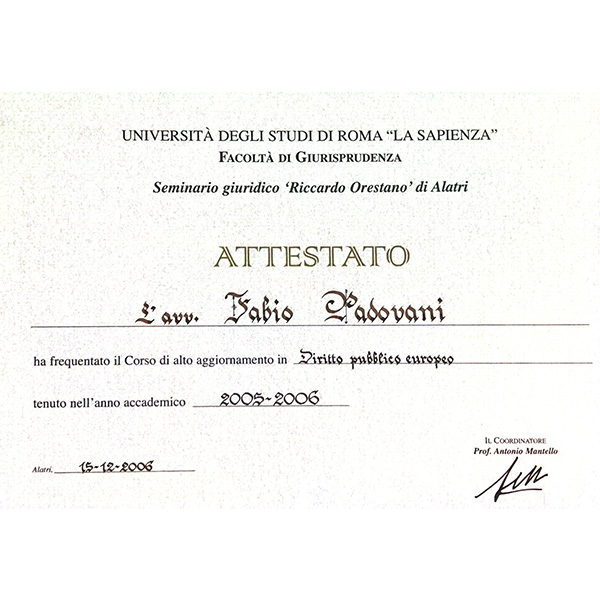 Negli anni successivi, ho continuato ad arricchire il mio bagaglio formativo, partecipando al Corso di Alta formazione in Diritto Pubblico Europeo nel 2005-6 presso l’Università La Sapienza di Roma.